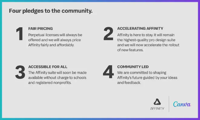Canva acquired Serif (company behind affinity) on March 26th, 2024. Meaning that Affinity would operate under Canva. Not long after they published a pledge to their community, stating that they would always be offering perpetual licenses and price it fairly and affordably.
