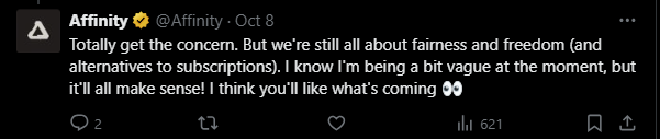 TL;DR Affinity is being very sketchy. Empty youtube channel, can’t purchase it anymore. They’ve been answering to people but never confirming the suspicions of going on a subscription model.