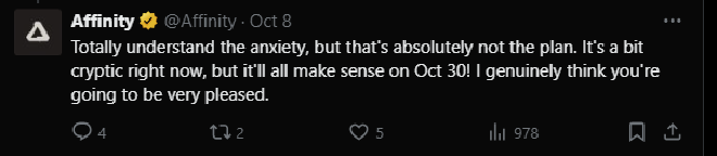 My guess? It would be a great time to announce Affinity V3. Maybe a discount or free version of V2 while we’re at it and that’s why they stopped selling it. Everything else would be a PR stunt to generate noise and gain attention.